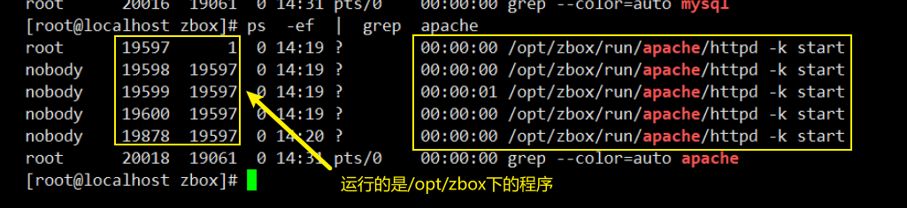 - 查看被占用的端口进程(ps -ef |grep mysql/apache)